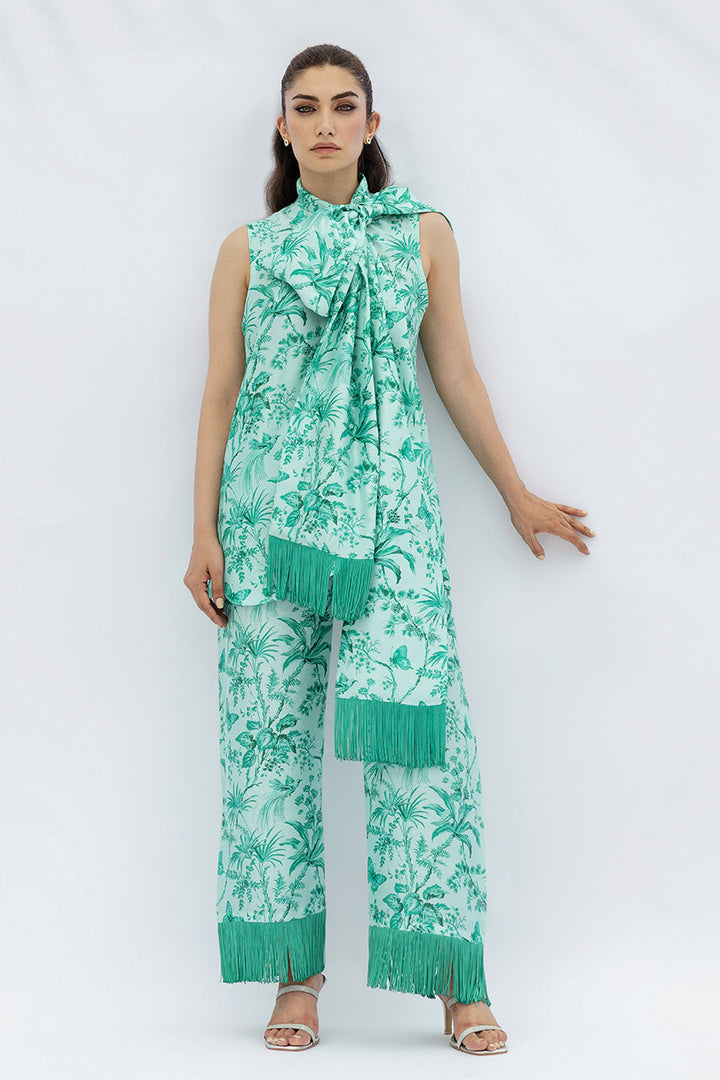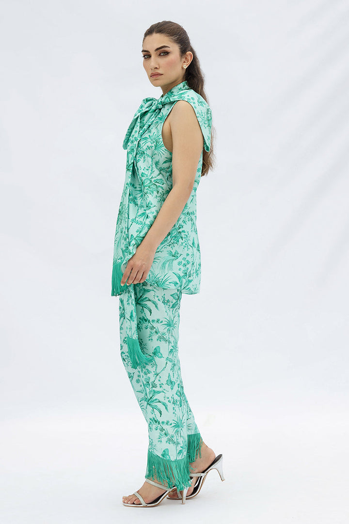 A study in sculpted grace, this pure rawsilk ensemble is imagined on a seafoam canvas etched with botanical motifs that recall the quiet poetry of a toile de Jouy garden. The sleeveless shirt falls in a straight line, its neckline accented with an oversized bow that drapes into long fringed panels. Paired with culottes edged in tonal fringe, the look captures a balance of modern minimalism and painterly romance through its fluid lines and tactile details.
