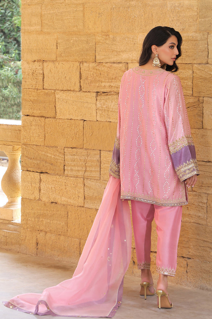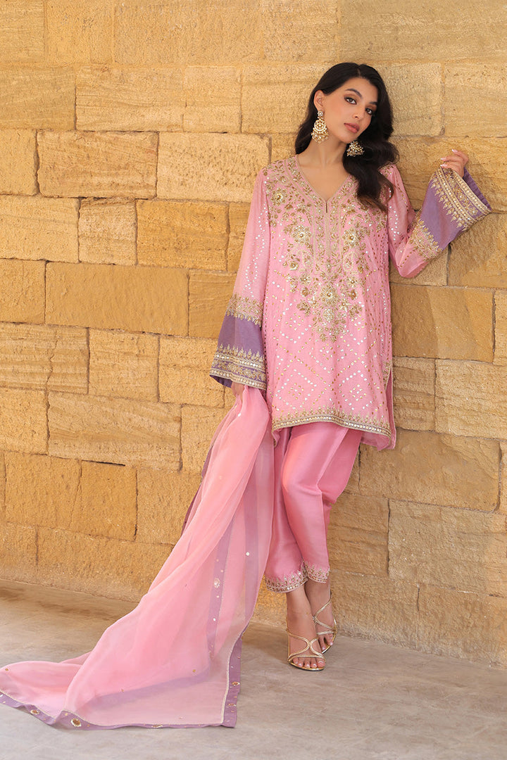 A relaxed cotton net kurta in flamingo pink is brought to life with delicate gota, zardoze, and resham florals, each stitch a nod to artisanal mastery. Statement lilac applique cuffs are framed with intricate tilla borders, lending a touch of contrast. Paired with a tailored pure rawsilk shalwar, its hem glinting with zardoze and sequins, the ensemble is anchored in quiet luxury. An ethereal organza dupatta, dusted with subtle shimmer and edged in lilac-hued embellishment, drapes the look in a whisper of vintage charm.
