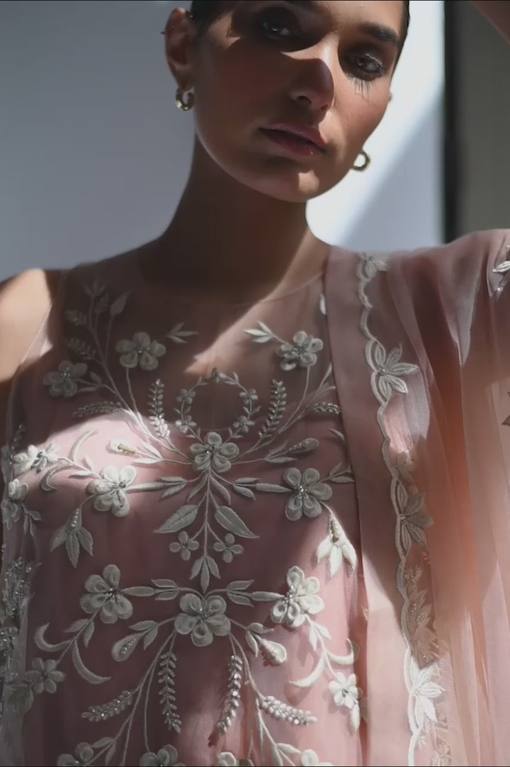 This blush pink short shirt is cut from a luxe tulle fabric and embroidered with cascading floral vines. Romantic and sophisticated, the piece is paired with white box trousers and an attached draped net dupatta that is finished with floral embroidery edging.