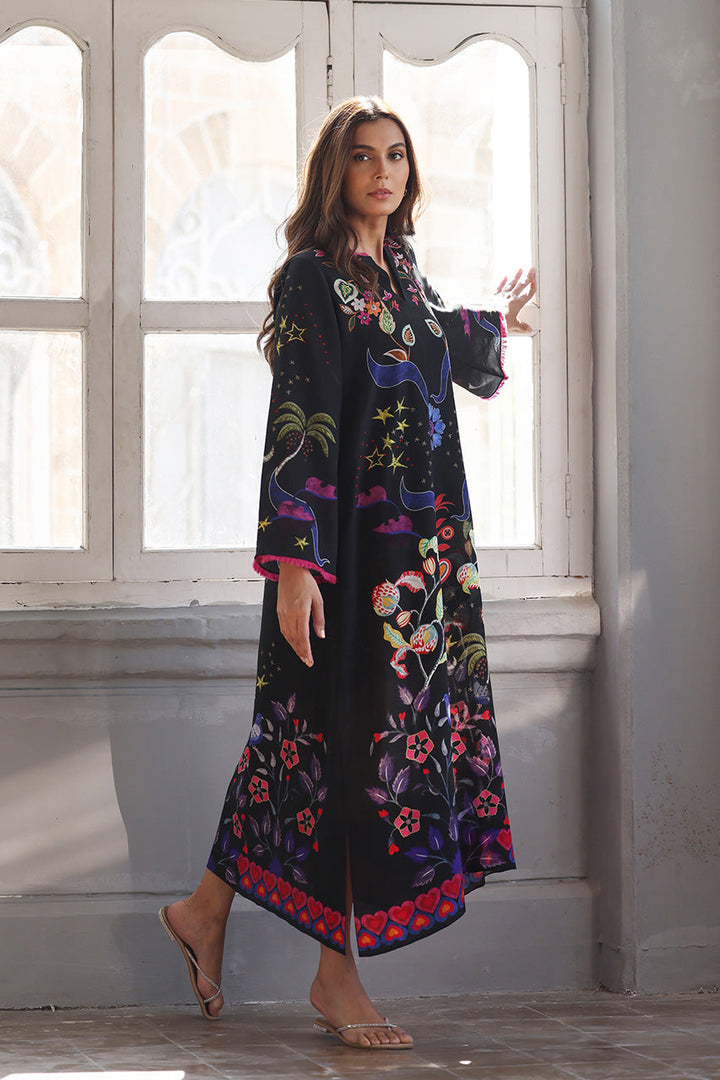 A playful ebony crepe kaftan showcases a whimsical multi-hued print with floral...