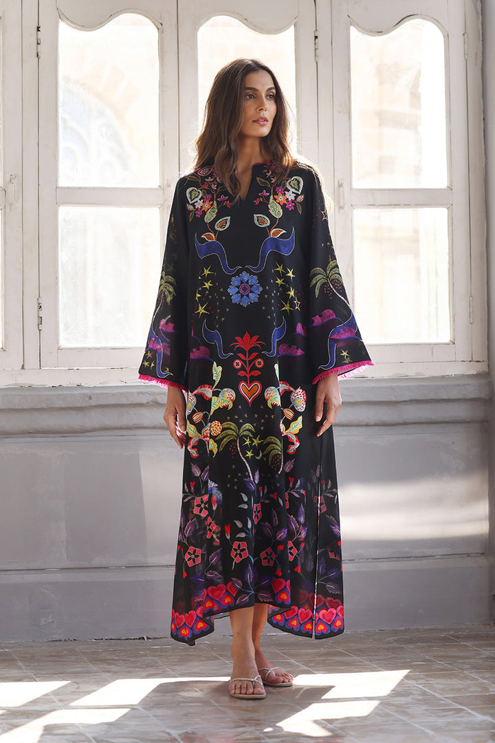 A playful ebony crepe kaftan showcases a whimsical multi-hued print with floral and heart patterns. The relaxed silhouette is adorned with scarlet detailing the sleeves.