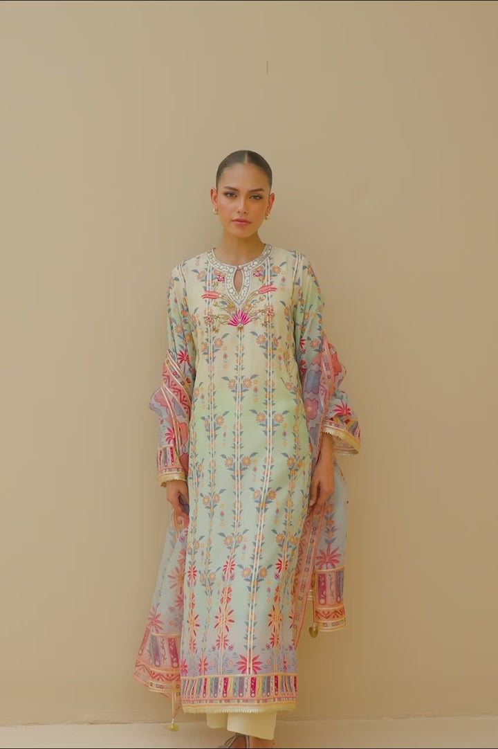 Delicate zardoze embroidery and gota detailing elevate this pastel-hued ombré shirt, crafted from khaddi silk. A seafoam base melts into soft shades of pink and coral, adorned with painterly floral motifs that create a gentle gradient of colour. A statement geometric border adds subtle depth, while a diaphanous organza dupatta with intricate gota accents ties the look together in serene pastels. Eggshell toned pure rawsilk trousers complete the ensemble with refined simplicity.