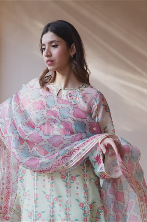 Delicate zardoze embroidery and gota detailing elevate a painterly pastel hued ombré shirt, crafted from lightweight khaddi silk. The mint green base is adorned with floral motifs in shades of pink and coral, creating a soft gradient of color. A statement border with geometric patterns and subtle accents adds depth, while a complementary organza dupatta, finished with intricate gota work, ties the look together in soft pastel tones. Eggshell toned pure rawsilk trousers complete the ensemble.