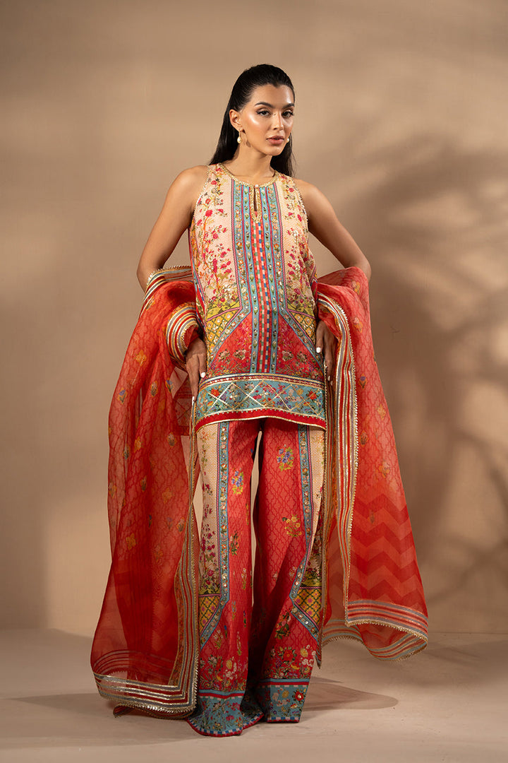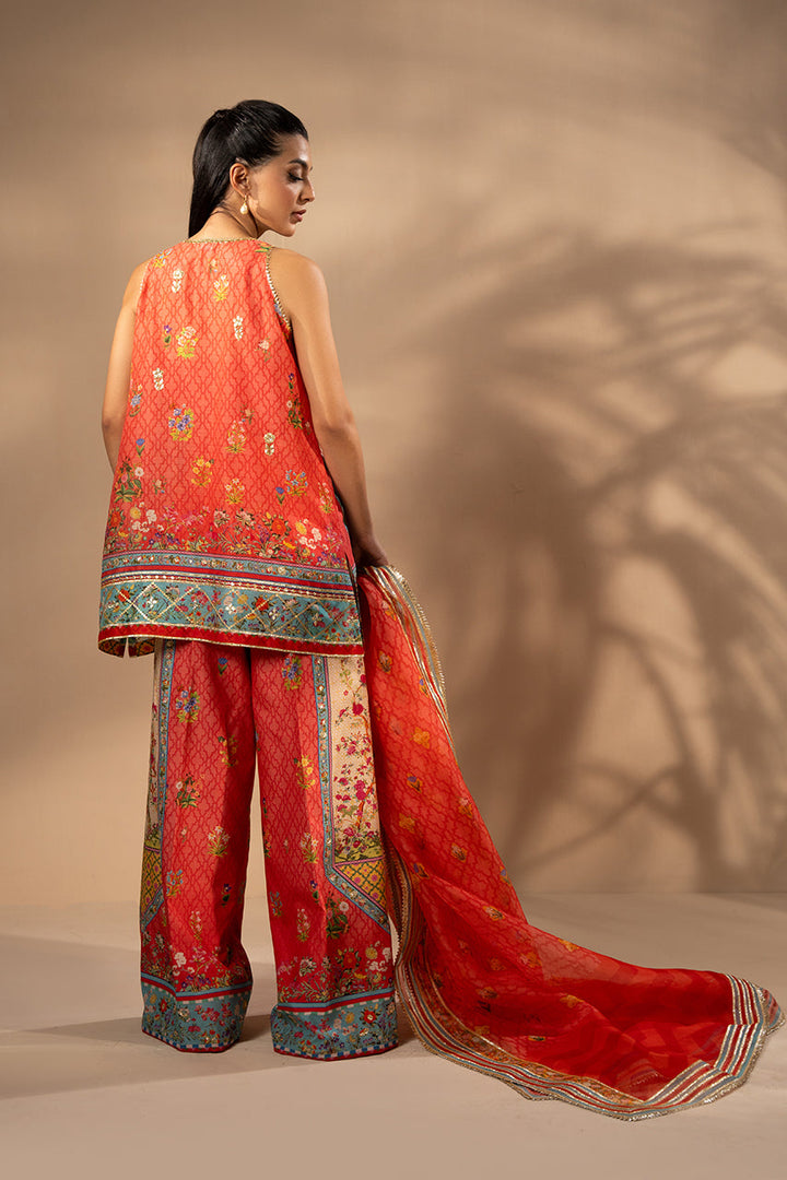 A sleeveless khaddi silk top in soft coral and blush tones features intricate floral painterly prints, accented with delicate gota and sequin embroidery. The cascading organza dupatta in coral is enriched with subtle turquoise and gold florals and finished with gota detailing along the borders. It is paired with wide-legged khaddi silk trousers adorned with a complementing print and scattered gota, offering a contemporary expression of traditional elegance.