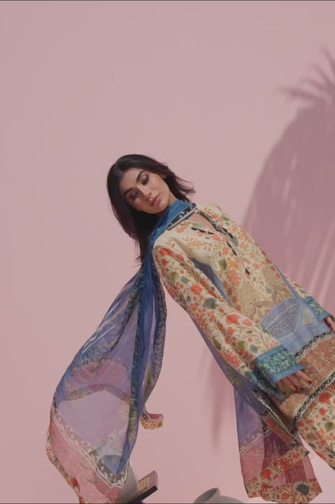 A blend of artistic prints and soft pastel tones elevates the cotton net shirt, which unfolds like a tapestry, transitioning seamlessly from a creamy beige bodice with subtle floral scrolls to soft pastel blue archways, framed by terracotta and olive botanical borders. Paired with khaddi silk shalwar that mirror the tunic’s rich floral motifs, the look is completed with a coordinating chiffon dupatta. Defined by its classic silhouette and maximalist patterning, this outfit embodies effortless bohemian luxury.