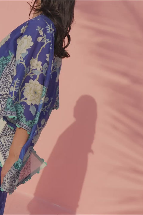 A fluid silhouette in vivid cobalt, brought to life with painterly florals and delicate avian motifs that drift across the surface. The relaxed tunic is framed with intricate borders along the neckline, sleeves, and hem, adding quiet structure to the airy form. Paired with coordinating tapered trousers rendered in a subtle tonal print, the ensemble balances softness with definition. The overall look captures effortless movement, refined detail, and a modern expression of print and colour.